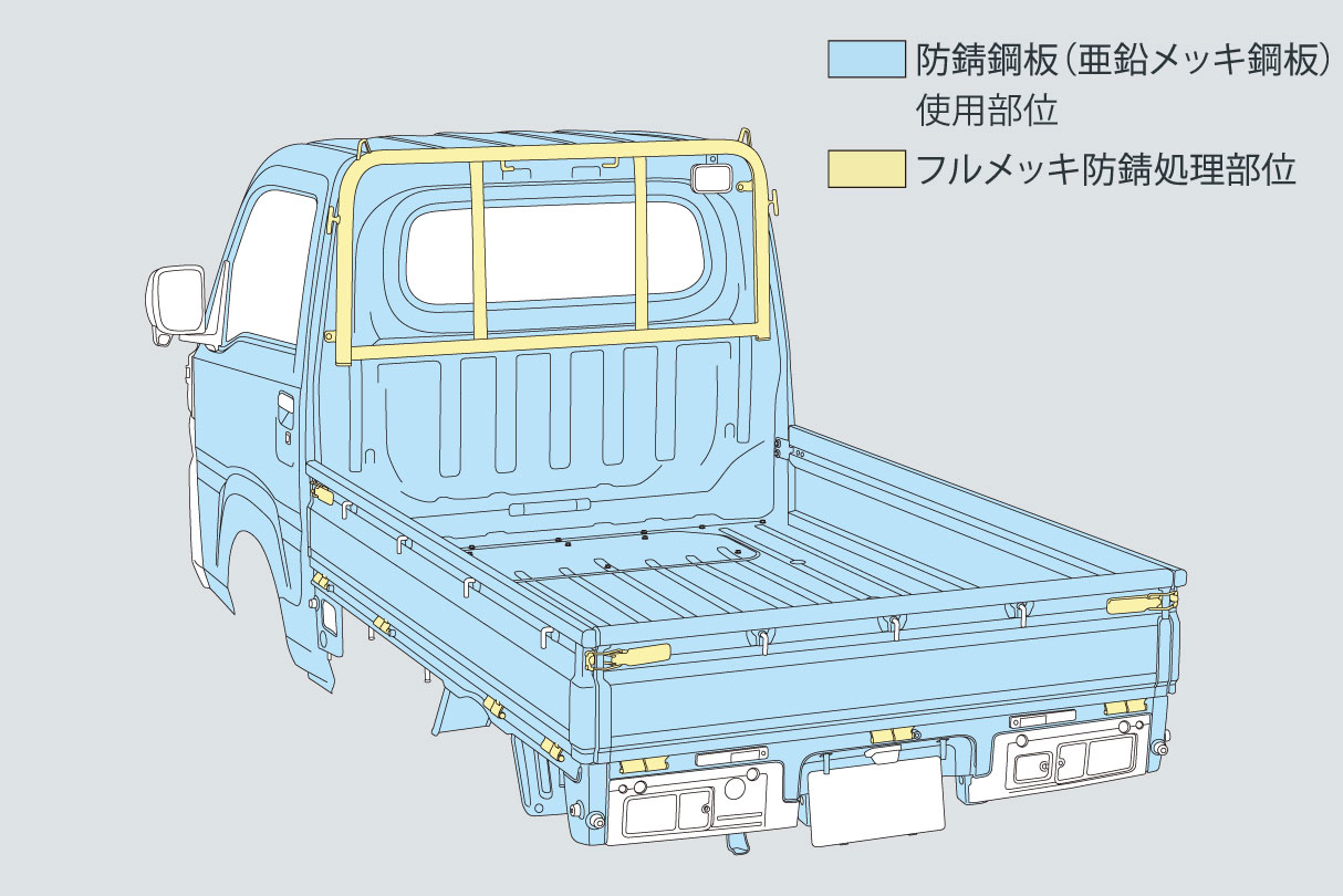 アッパーボディ表面積100%に防錆鋼板(亜鉛メッキ鋼板)を使用。