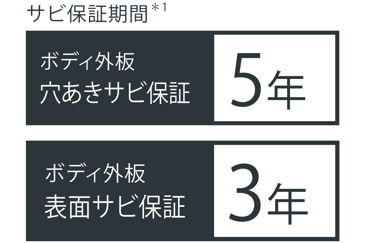 高い防錆性能に裏付けられた、サビ長期保証を全車に。ボディ外板穴あきサビは荷台を含み5年、ボディ外板表面は荷台を含み3年保証します。